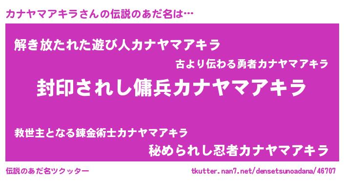 | 男性向けラノベタイトル風あだ名 | 『カナヤマアキラに滅ぼされるだけの簡単なお仕事です』 |