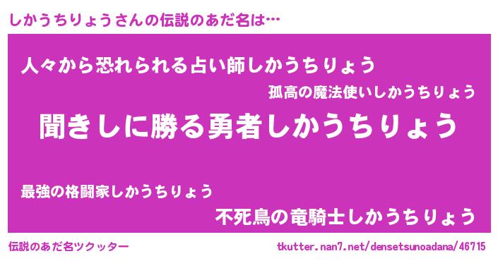 | 男性向けラノベタイトル風あだ名 | 『しかうちりょうという概念が存在しない退屈な世界 』 |