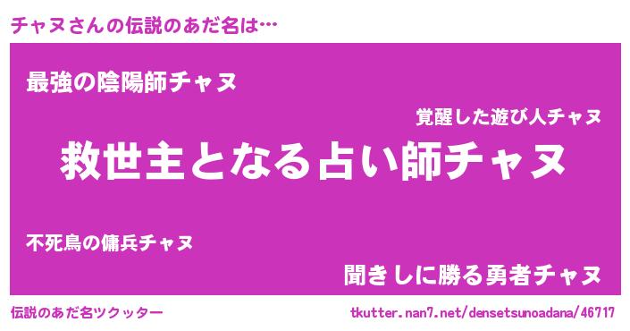 | 男性向けラノベタイトル風あだ名 | 『ノーゲーム・ノーチャヌ』 |