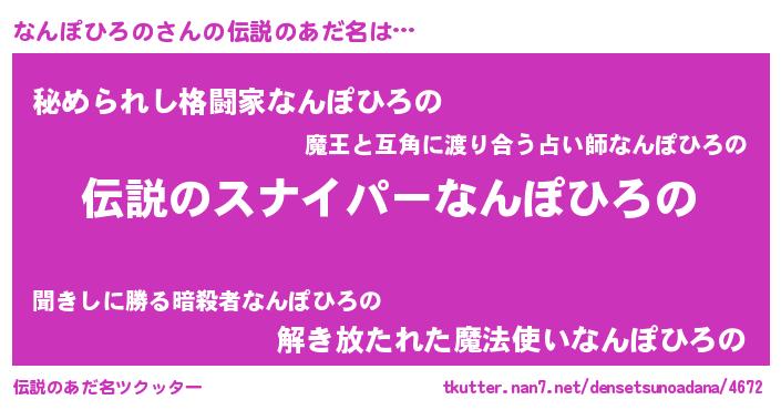 | ヒーロー風カッコイイあだ名 | 『スーパーナンポヒロノ』『炎刃騎士ナン』 |