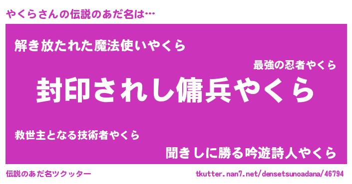 | 男性向けラノベタイトル風あだ名 | 『この素晴らしい世界にやくらを!』 |