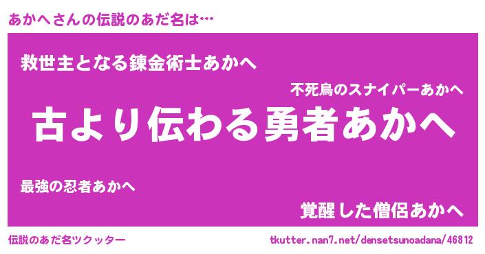 | 意味不明あだ名 | 『永久保存あかへ』『自称あかへ』 |