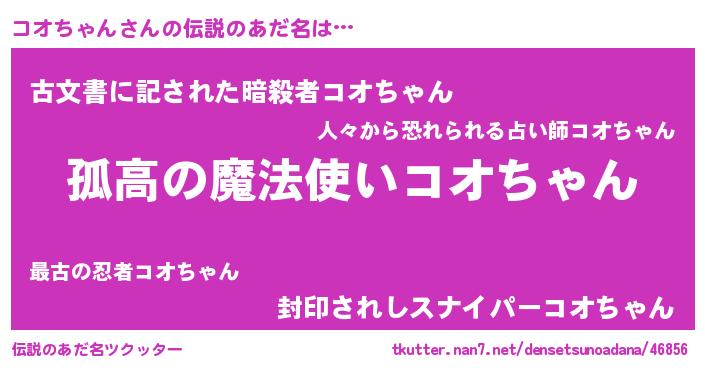 | 胡散臭い通販商品みたいなあだ名 | 『信頼と実績のサプリメント…その名も「コオちゃん」』 |