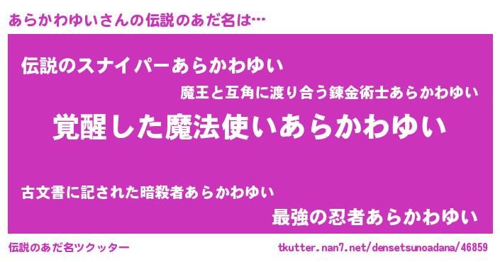 | 男性向けラノベタイトル風あだ名 | 『あらかわゆいの嫁は女の子じゃないと思った?』 |