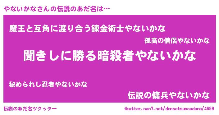 | 女子向けラノベタイトル風あだ名 | 『やないかななんてお断りですっ。』 |