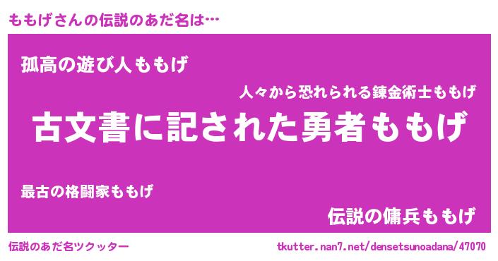 | ヒーロー風カッコイイあだ名 | 『ネオモモゲ』『暗黒騎士モモ』 |