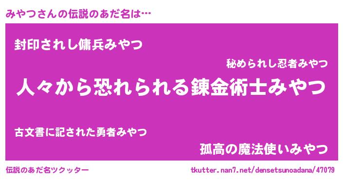 | ヒーロー風カッコイイあだ名 | 『超時空戦士ミヤツ』『慈愛の使者みやつ』 |