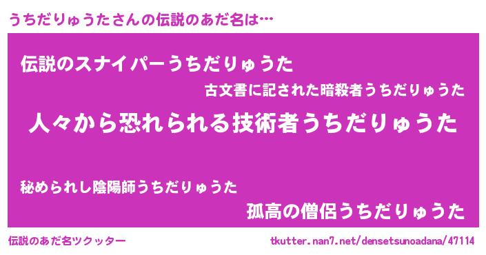 | 男性向けラノベタイトル風あだ名 | 『おまえをオタクにしてやるから、俺をうちだりゅうたにしてくれ! 』 |