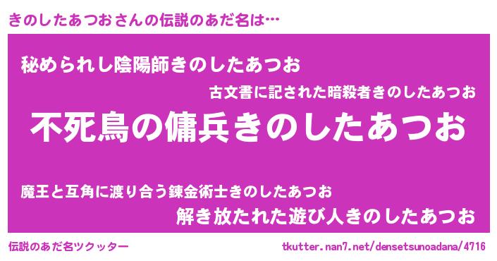 | 男性向けラノベタイトル風あだ名 | 『キノシタアツオアートオンライン』 |