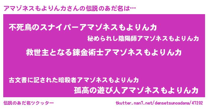 | ヒーロー風カッコイイあだ名 | 『慈愛の使者アマゾネスもよりんカ』 |
