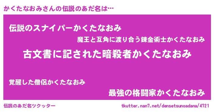 | 男性向けラノベタイトル風あだ名 | 『かくたなおみに滅ぼされるだけの簡単なお仕事です』 |