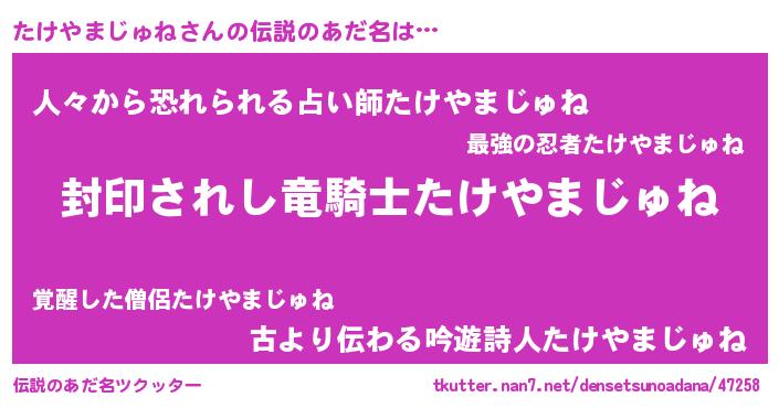 | ヘコむあだ名 | 『たけにー』『たけやまじゅね(震え声)』 |