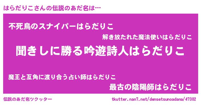 | 女子向けラノベタイトル風あだ名 | 『異世界で失敗しない100のはらだりこ』 |