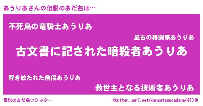 | 意味不明あだ名 | 『永久保存あうりあ』『自称あうりあ』 |