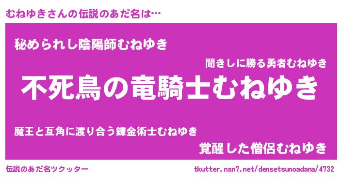 | 男性向けラノベタイトル風あだ名 | 『むねゆきの憂鬱』『魔弾の王とむねゆき』 |