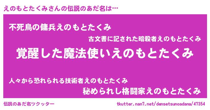 | 男性向けラノベタイトル風あだ名 | 『うちのえのもとたくみが世界を掌握している!』 |