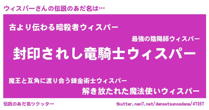 | ヒーロー風カッコイイあだ名 | 『仮面ウィダー』『スーパーウィスパー』 |