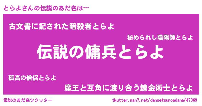 | 男性向けラノベタイトル風あだ名 | 『はたらくとらよさま!』『とらよの憂鬱』 |