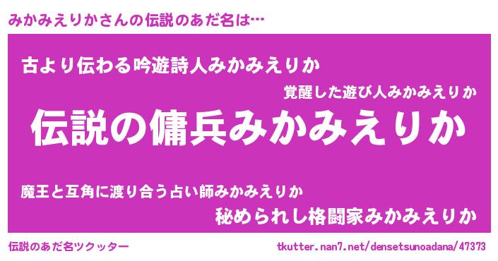 | ヘコむあだ名 | 『みかもー』『みかみえりか(笑)』 |