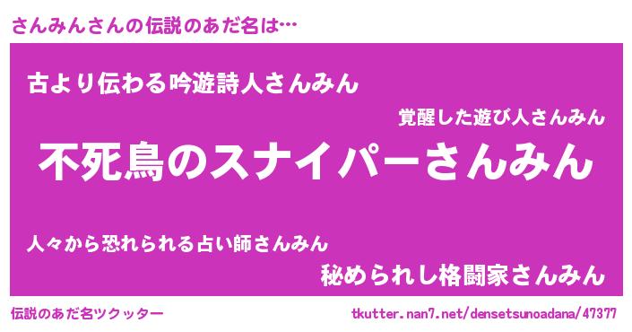 | 胡散臭い通販商品みたいなあだ名 | 『モテモテ間違いなし霊験あらたかなお札…その名も「さんみん」』 |