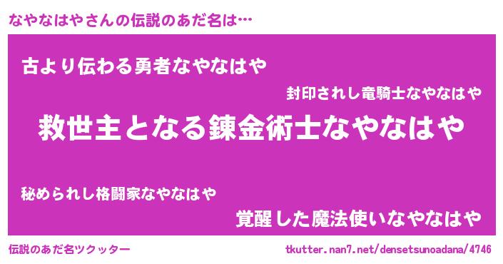 | 男性向けラノベタイトル風あだ名 | 『ノーゲーム・ノーナヤナハヤ』 |