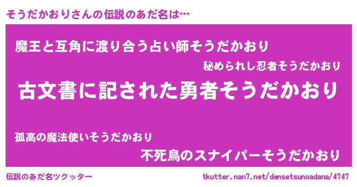 女子向けラノベタイトル風あだ名 | 『闇のそうだかおり』 |