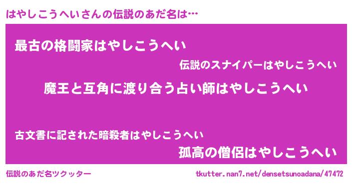 | 男性向けラノベタイトル風あだ名 | 『転生したらはやしこうへいだった件』 |