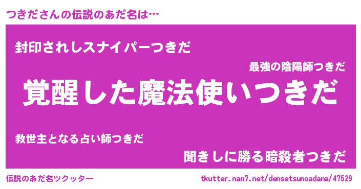 | ヒーロー風カッコイイあだ名 | 『天弓騎士ツキ』『スーパーツキダ』 |