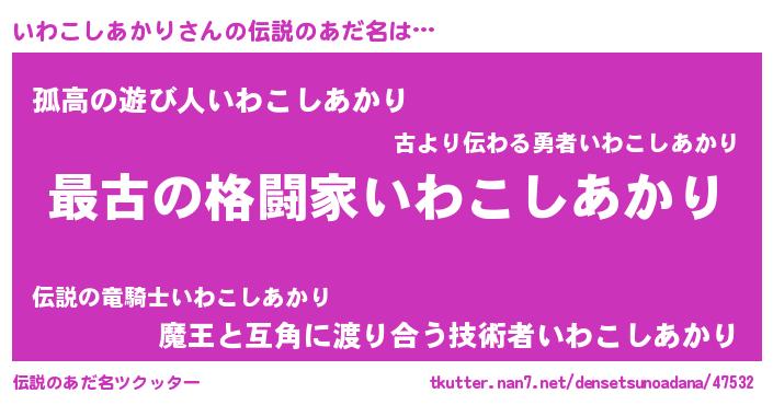 | 男性向けラノベタイトル風あだ名 | 『魔弾の王といわこしあかり』 |
