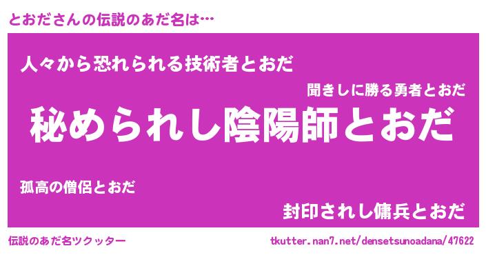 | ポケモン風あだ名 | 『トオダダネ』『トオゴンZ』 |