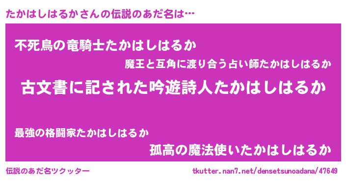 | ヒーロー風カッコイイあだ名 | 『ネオタカハシハルカ』『暗黒騎士タカ』 |