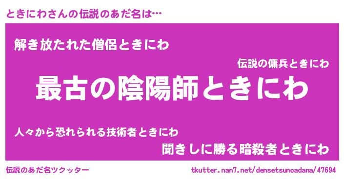| ヒーロー風カッコイイあだ名 | 『仮面トキダー』『ウルトラときにわマン』 |
