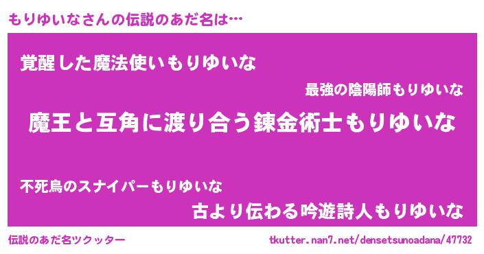 | ヒーロー風カッコイイあだ名 | 『慈愛の使者もりゆいな』『天弓騎士モリ』 |