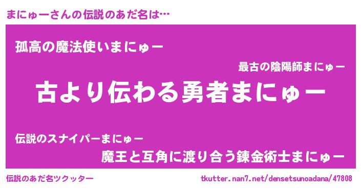 | 意味不明あだ名 | 『永久保存まにゅー』『自称まにゅー』 |