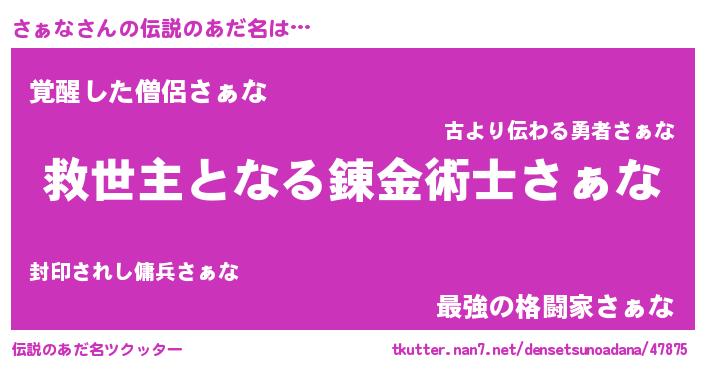 | ヒーロー風カッコイイあだ名 | 『究極戦士サァナ』『天空の使者さぁな』 |