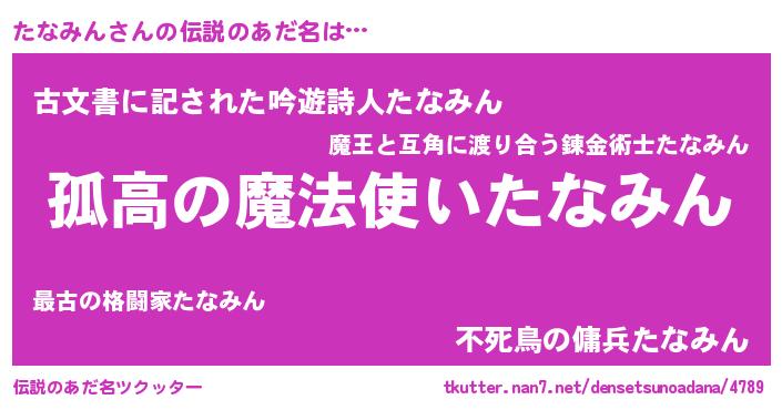 | 男性向けラノベタイトル風あだ名 | 『魔弾の王とたなみん』『たなみんの憂鬱』 |