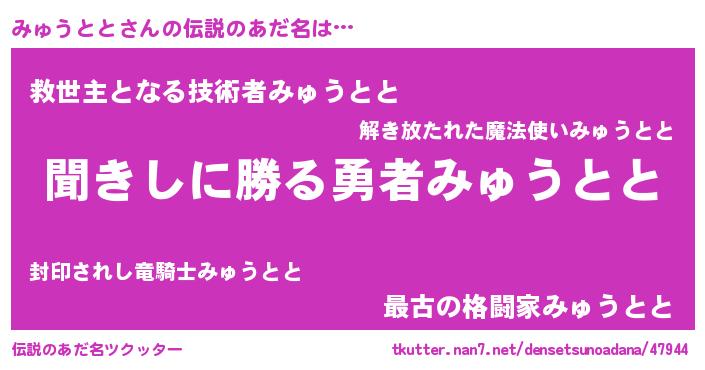 | 意味不明あだ名 | 『自称みゅうとと』『永久保存みゅうとと』 |