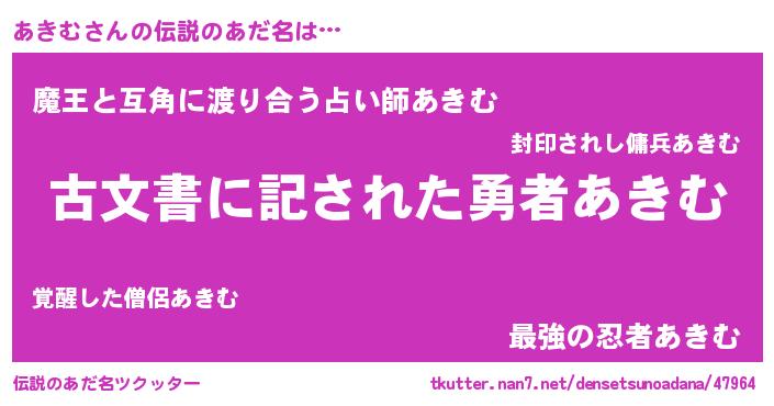 | 意味不明あだ名 | 『自称あきむ』『エリンギ科あきむ属』 |
