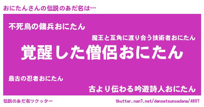 | 男性向けラノベタイトル風あだ名 | 『おにたんの嫁は女の子じゃないと思った?』 |