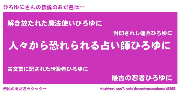 | 男性向けラノベタイトル風あだ名 | 『おまえをオタクにしてやるから、俺をひろゆににしてくれ! 』 |