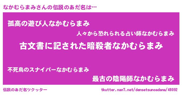 | 男性向けラノベタイトル風あだ名 | 『なかむらまみに滅ぼされるだけの簡単なお仕事です』 |