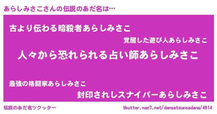 | 男性向けラノベタイトル風あだ名 | 『おまえをオタクにしてやるから、俺をあらしみさこにしてくれ! 』 |