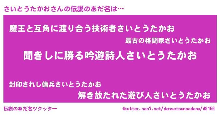 | ヒーロー風カッコイイあだ名 | 『ネオサイトウタカオ』『仮面サイダー』 |