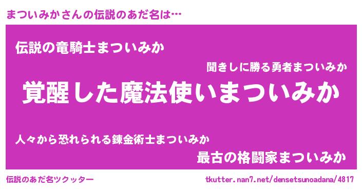 | 男性向けラノベタイトル風あだ名 | 『まついみかの嫁は女の子じゃないと思った?』 |