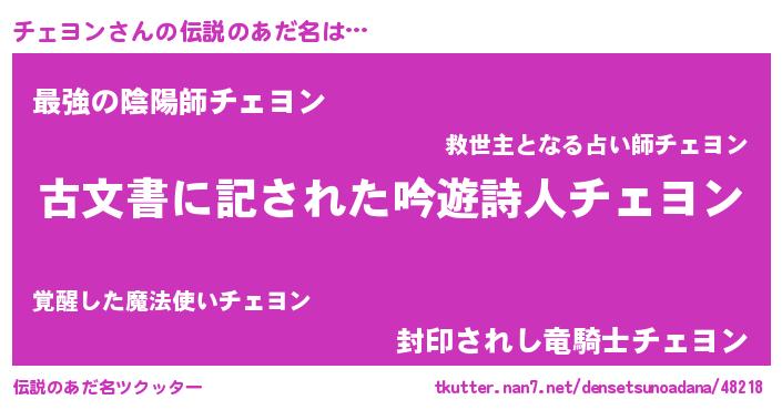 | 男性向けラノベタイトル風あだ名 | 『チェヨン~年齢イコール彼女いない歴の魔法使い~』 |