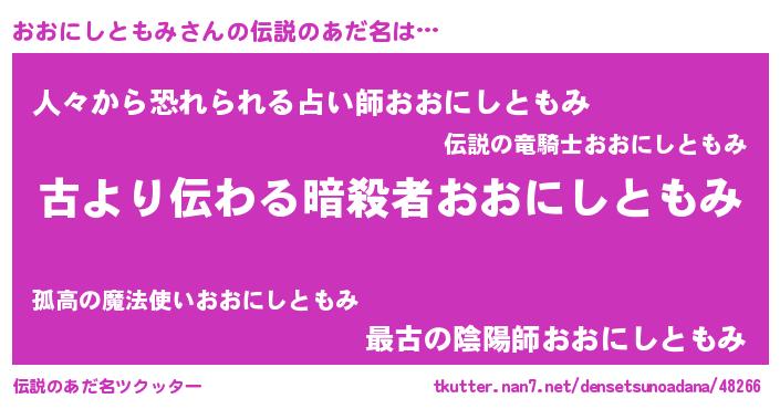 | 男性向けラノベタイトル風あだ名 | 『誰もが恐れるあのおおにしともみが、ぼくの専属メイドになるようです。』 |