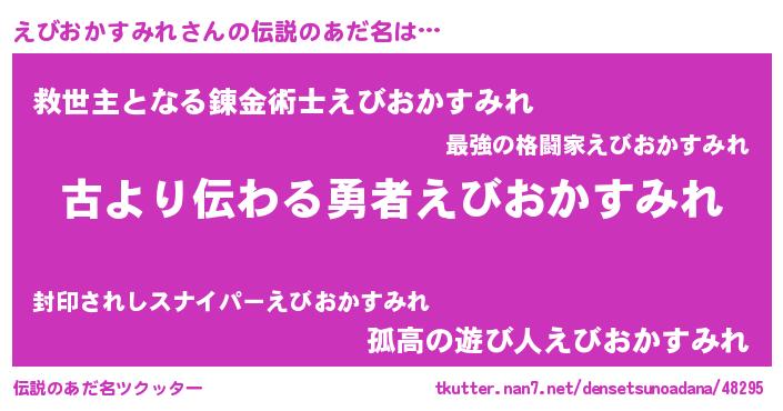 | 胡散臭い通販商品みたいなあだ名 | 『来世でも幸せになれる水素水…その名も「えびおかすみれ」』 |