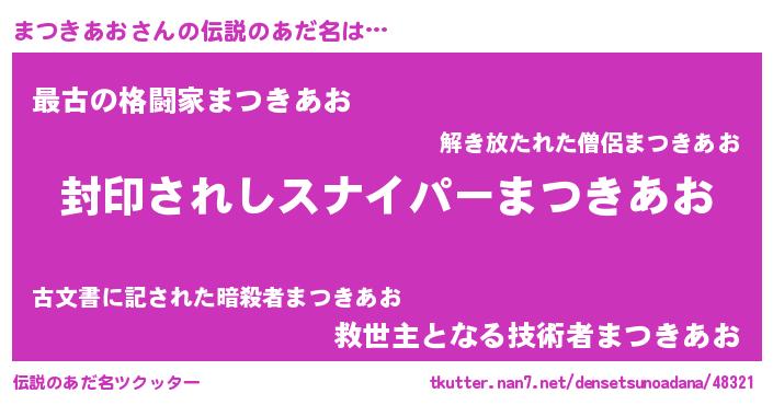 | 胡散臭い通販商品みたいなあだ名 | 『あなたにだけ特別に提供する世界で10本だけ現存している希少なブランデー…その名も「まつきあお」』 |