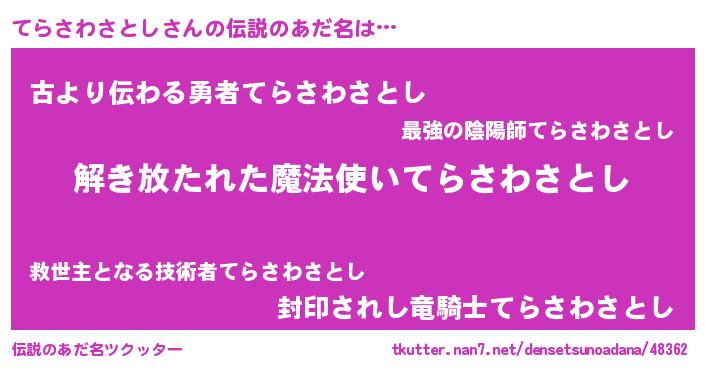 | 男性向けラノベタイトル風あだ名 | 『魔弾の王とてらさわさとし』 |
