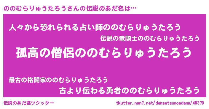 | 男性向けラノベタイトル風あだ名 | 『ダンジョンにののむらりゅうたろうを求めるのは間違っているだろうか』 |